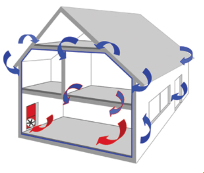 Специализированный манометрический способ контроля и проверки герметичности конструкций, предназначенный для проведения натурных испытаний воздухопроницаемости ограждающих конструкций здания, измерения кратности воздухообмена здания, а также для оценки герметичности отдельных помещений или секций здания.