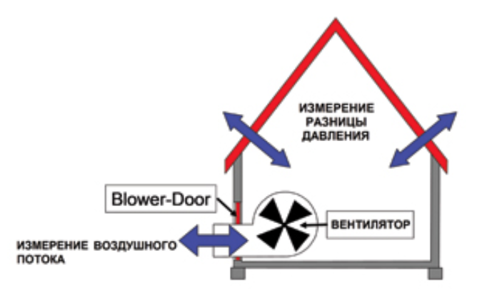 Метод Blower-Door можно коротко описать следующим образом: в здании закрывают все двери и окна, вентиляционные каналы, печные и каминные трубы. Фактически создаются обычные условия эксплуатации жилища. С помощью вентилятора, установленного в дверной проем (дословно BLOWERDOOR означает «вентилятор в двери»), из дома откачивается воздух до момента, когда разница внутреннего и наружного давления не достигнет 50 Па. При этом измеряется объемный расход воздуха через вентилятор и время, за которое был создан такой перепад давления.